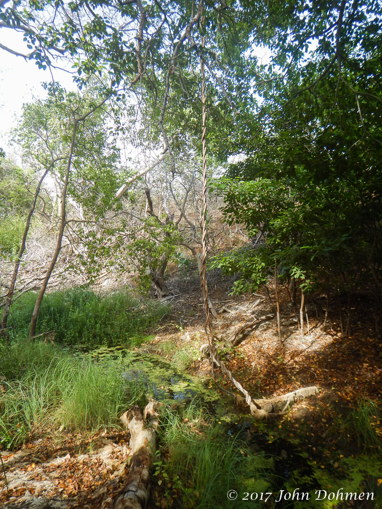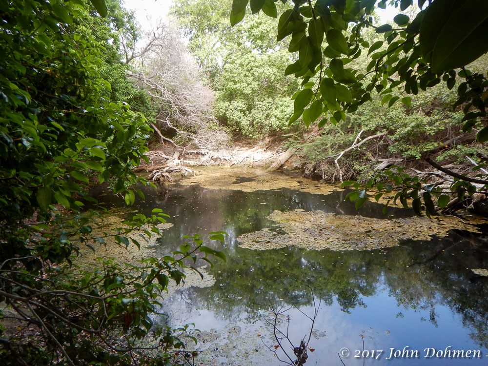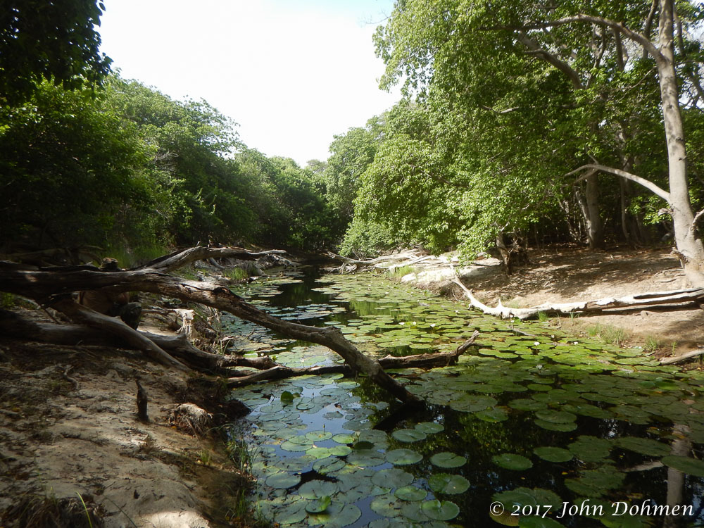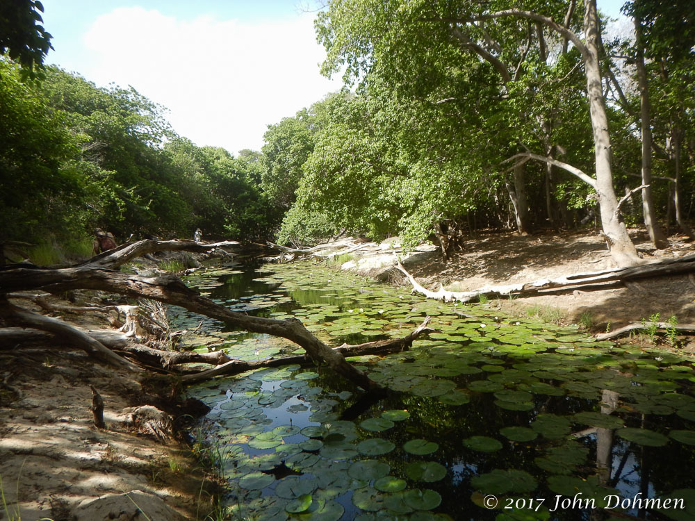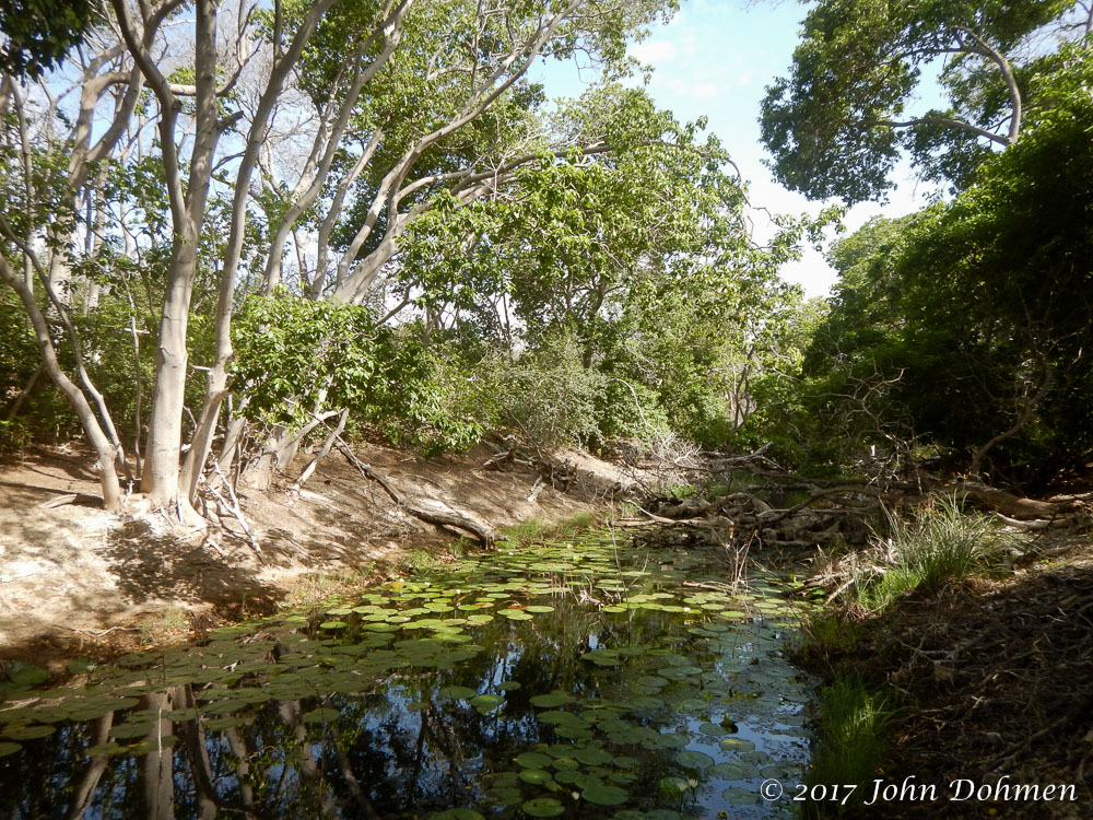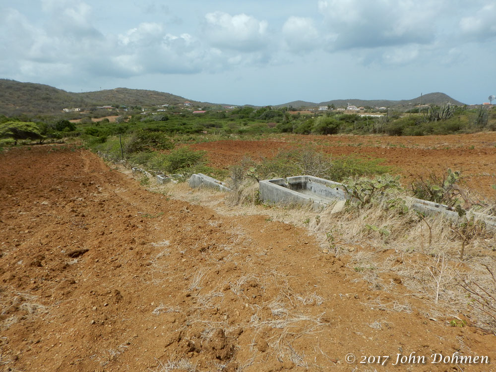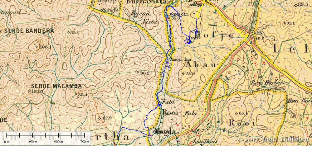 Het plan was om een voor ons doen relatief gemakkelijke tocht te houden. We hadden een verjaardag te vieren, dus de tocht kon niet te lang duren. Om 8 uur 's morgens troffen we elkaar bij de rotonde op de weg van Barber naar Santa Crus. Toen waren al twee auto's geparkeerd bij een bevriende kunukeru aan het einde van onze geplande route. We reden naar Hofi Abou, waar we onze auto's konden parkeren. Vandaar ging de route eerst naar een grote tanki op het terrein van Hofi Abou en daarna liepen we in de richting van Rooi Magdalena, die al van afstand herkenbaar was door de groene Manzaliñabomen. Vervolgens volgden we de rooi. Die was eerst alleen maar zichtbaar als een smal stroompje; dat stroompje werd geleidelijk breder, maar eindigde bij een mooie stenen dam. Aan de andere zijde van de dam vonden we in eerste instantie geen water, maar dat veranderde snel. Al snel troffen we een brede rooi met daarin veel bloeiende waterlelies en omzoomd door frisgroene manzaliñabomen. Een prachtig gebied, heel on-Curacaos aandoend. Stroomafwaarts vonden we nog een grote aarden dam. Onze wandeling eindigde op het terrein van de kunukeru, die ons tegemoet kwam lopen. Hij toonde ons nog een in het verleden aangelegd bewateringssysteem.