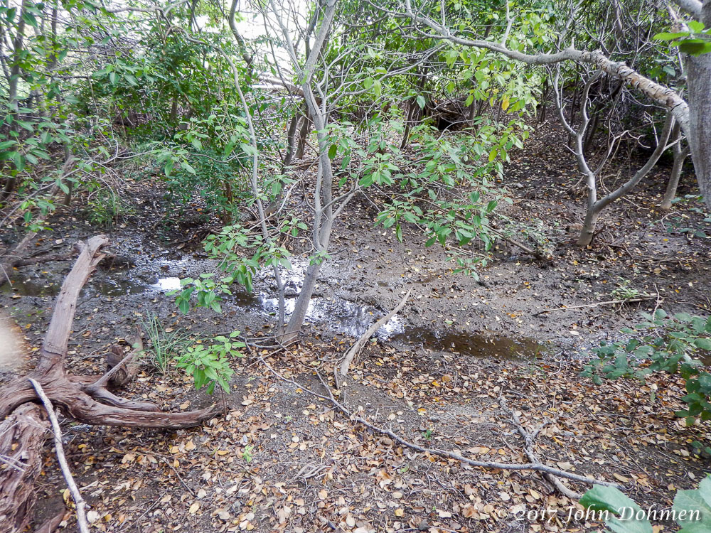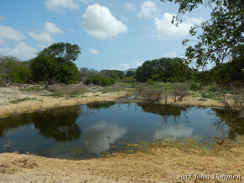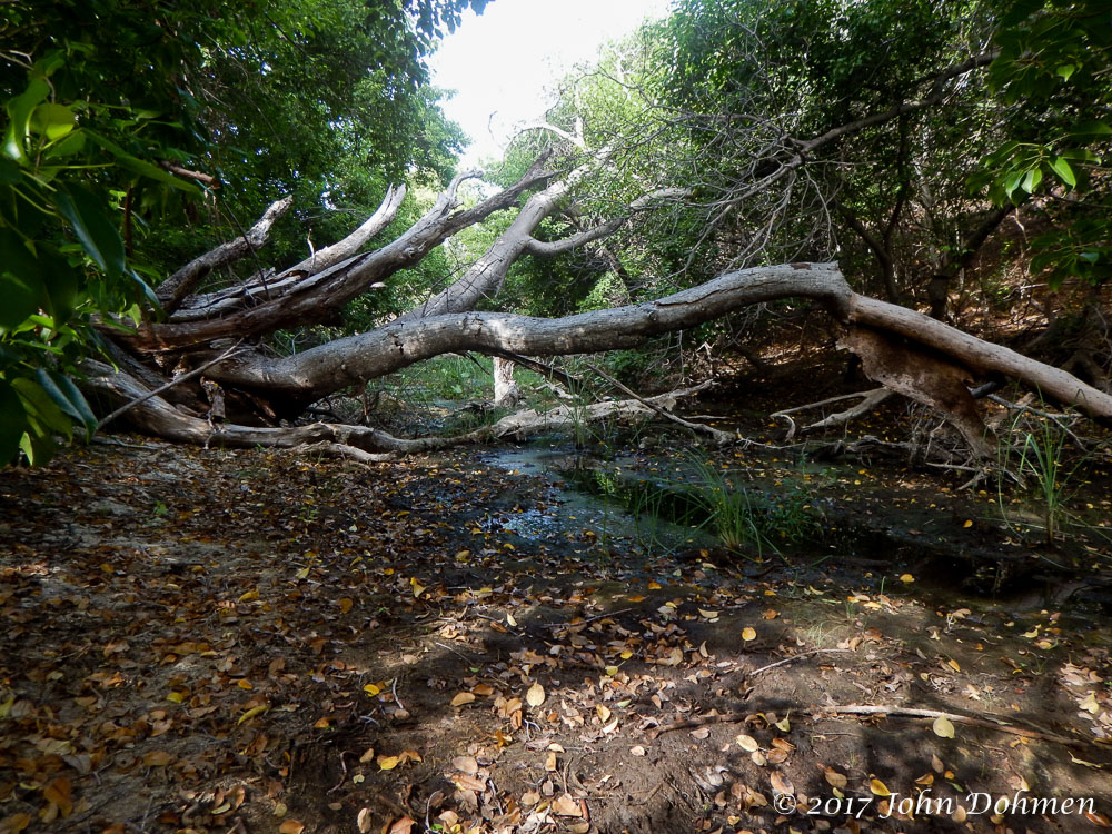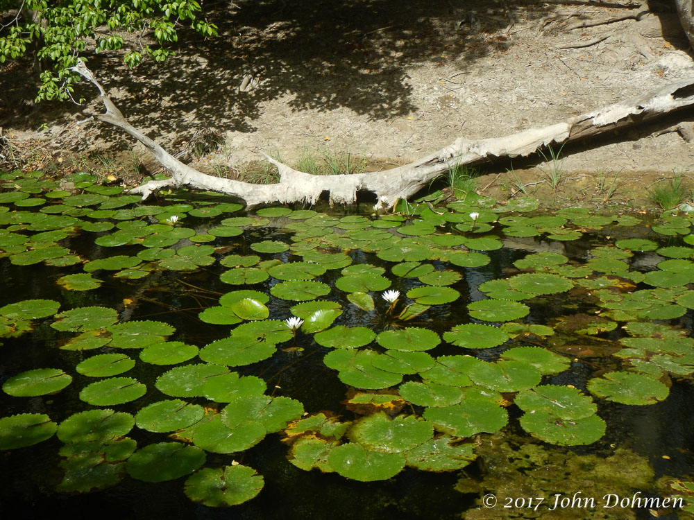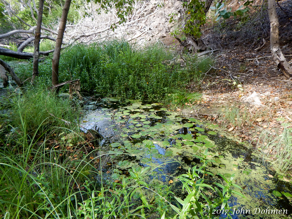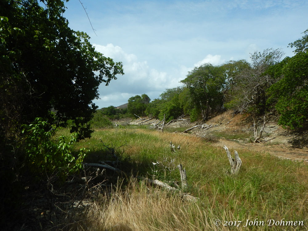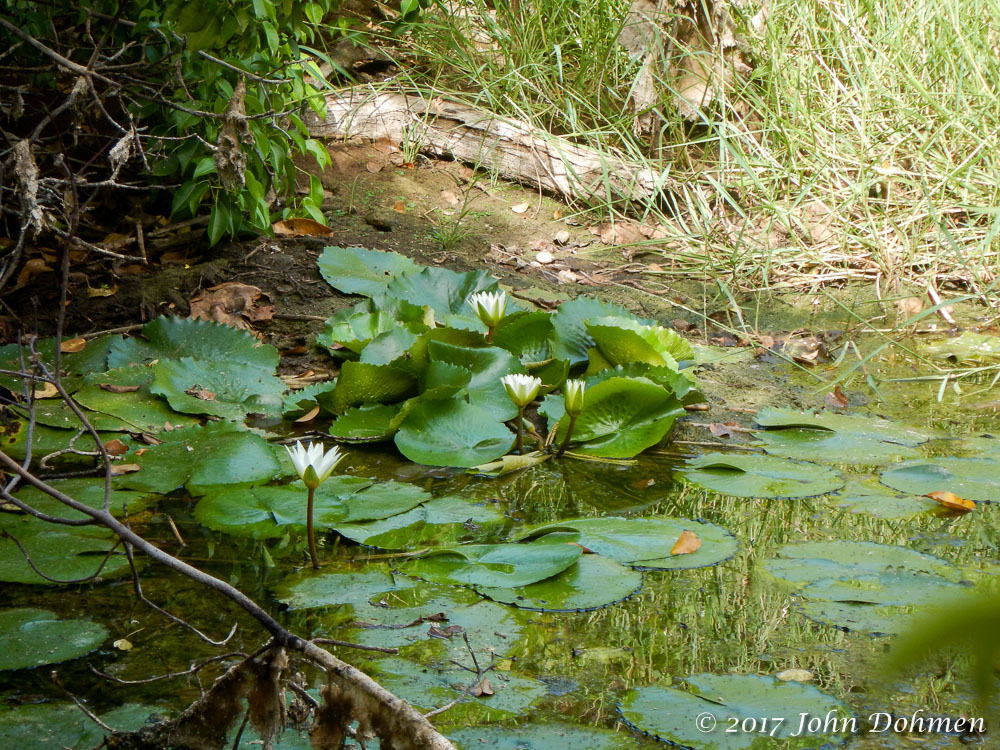 Het plan was om een voor ons doen relatief gemakkelijke tocht te houden. We hadden een verjaardag te vieren, dus de tocht kon niet te lang duren. Om 8 uur 's morgens troffen we elkaar bij de rotonde op de weg van Barber naar Santa Crus. Toen waren al twee auto's geparkeerd bij een bevriende kunukeru aan het einde van onze geplande route. We reden naar Hofi Abou, waar we onze auto's konden parkeren. Vandaar ging de route eerst naar een grote tanki op het terrein van Hofi Abou en daarna liepen we in de richting van Rooi Magdalena, die al van afstand herkenbaar was door de groene Manzaliñabomen. Vervolgens volgden we de rooi. Die was eerst alleen maar zichtbaar als een smal stroompje; dat stroompje werd geleidelijk breder, maar eindigde bij een mooie stenen dam. Aan de andere zijde van de dam vonden we in eerste instantie geen water, maar dat veranderde snel. Al snel troffen we een brede rooi met daarin veel bloeiende waterlelies en omzoomd door frisgroene manzaliñabomen. Een prachtig gebied, heel on-Curacaos aandoend. Stroomafwaarts vonden we nog een grote aarden dam. Onze wandeling eindigde op het terrein van de kunukeru, die ons tegemoet kwam lopen. Hij toonde ons nog een in het verleden aangelegd bewateringssysteem.